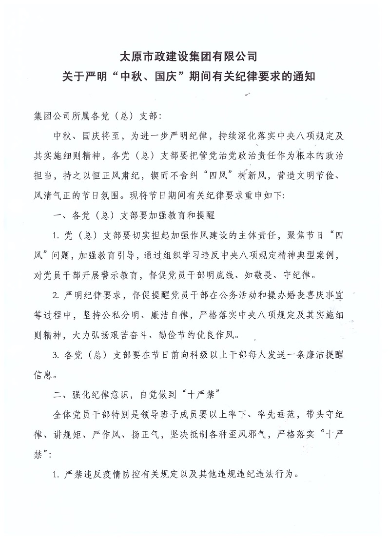 致太原市政建設集團有限公司全體黨員的廉政倡議書及太原市政建設集團有限公司關于嚴明“中秋、國慶”期間有關紀律要求的通知