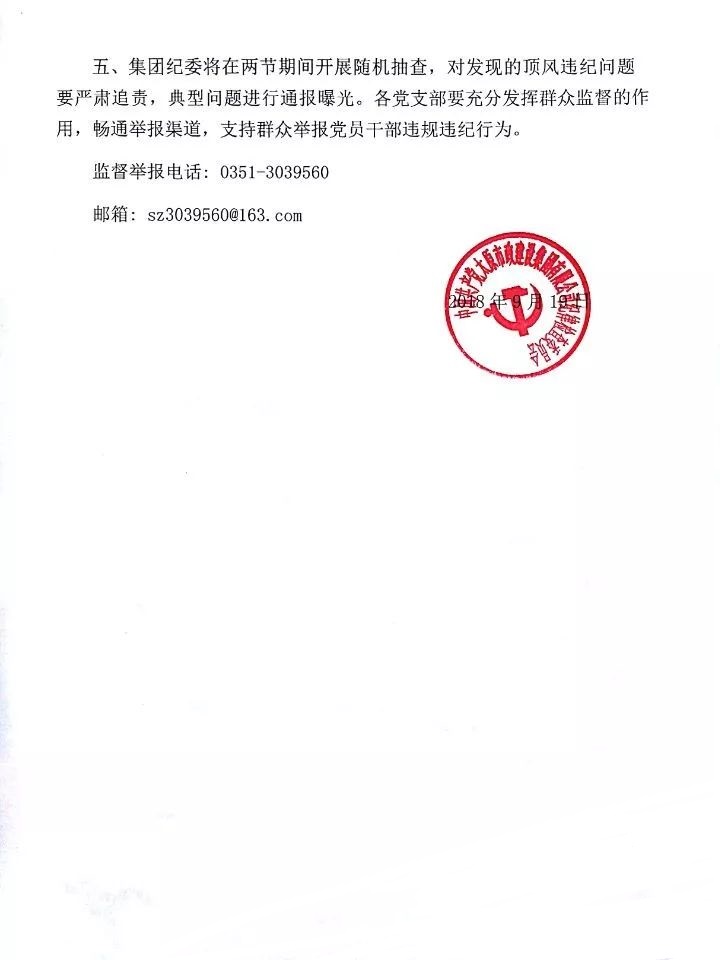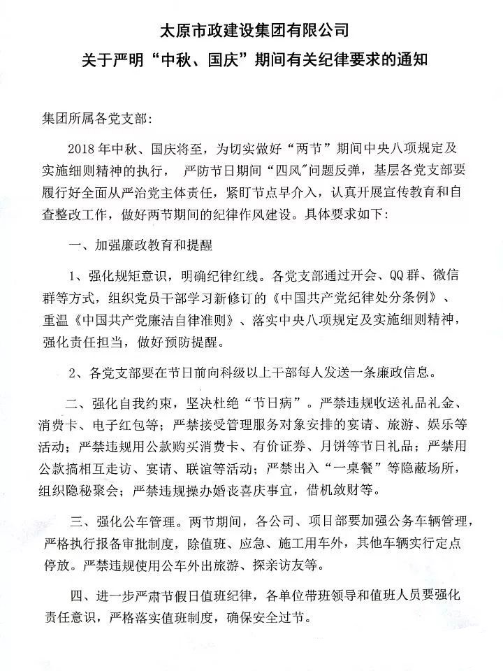 太原市政建設集團有限公司關于嚴明“中秋、國慶”期間有關紀律要求的通知