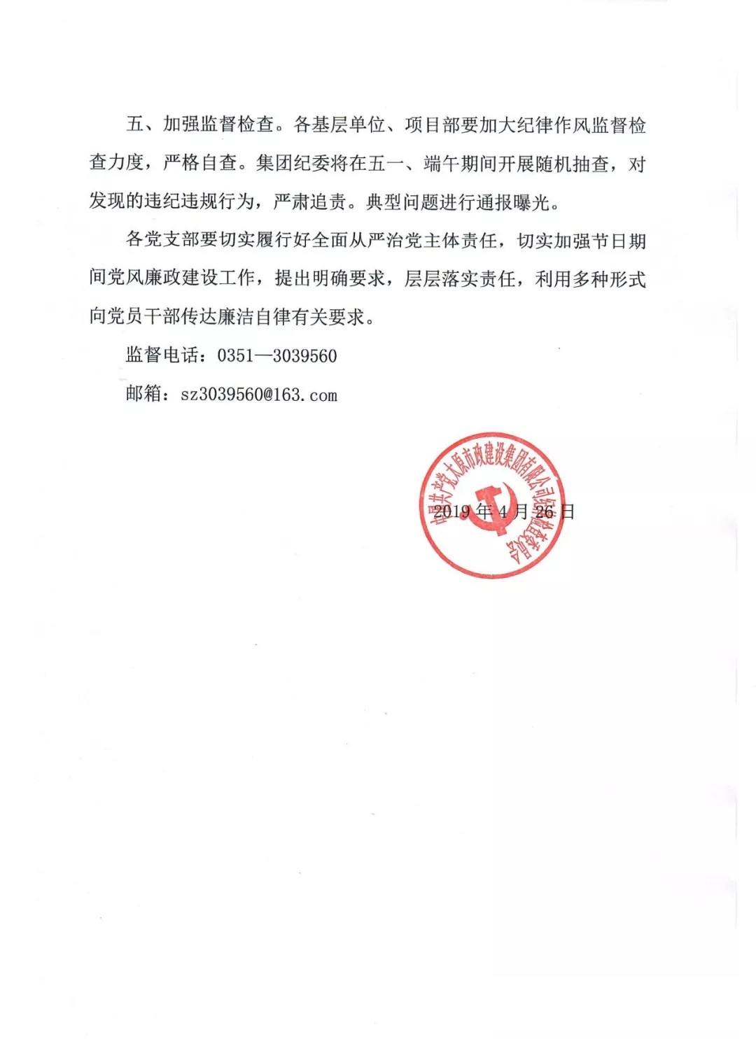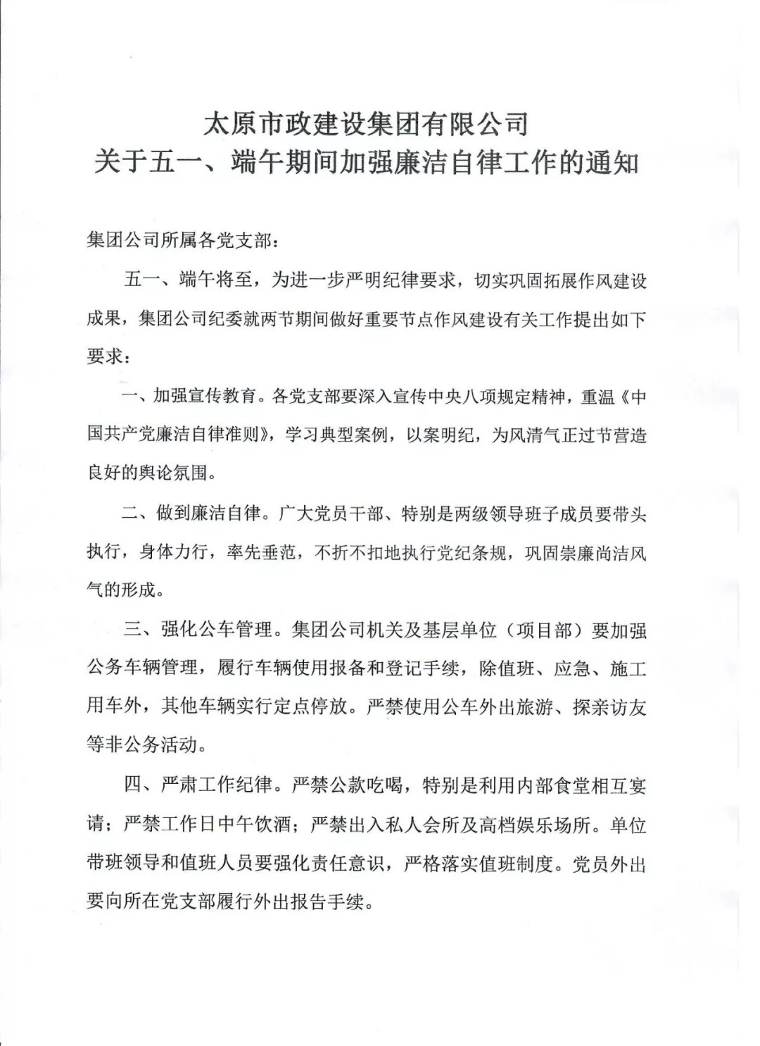 《太原市政建設集團有限公司關于五一、端午期間加強廉潔自律工作的通知》