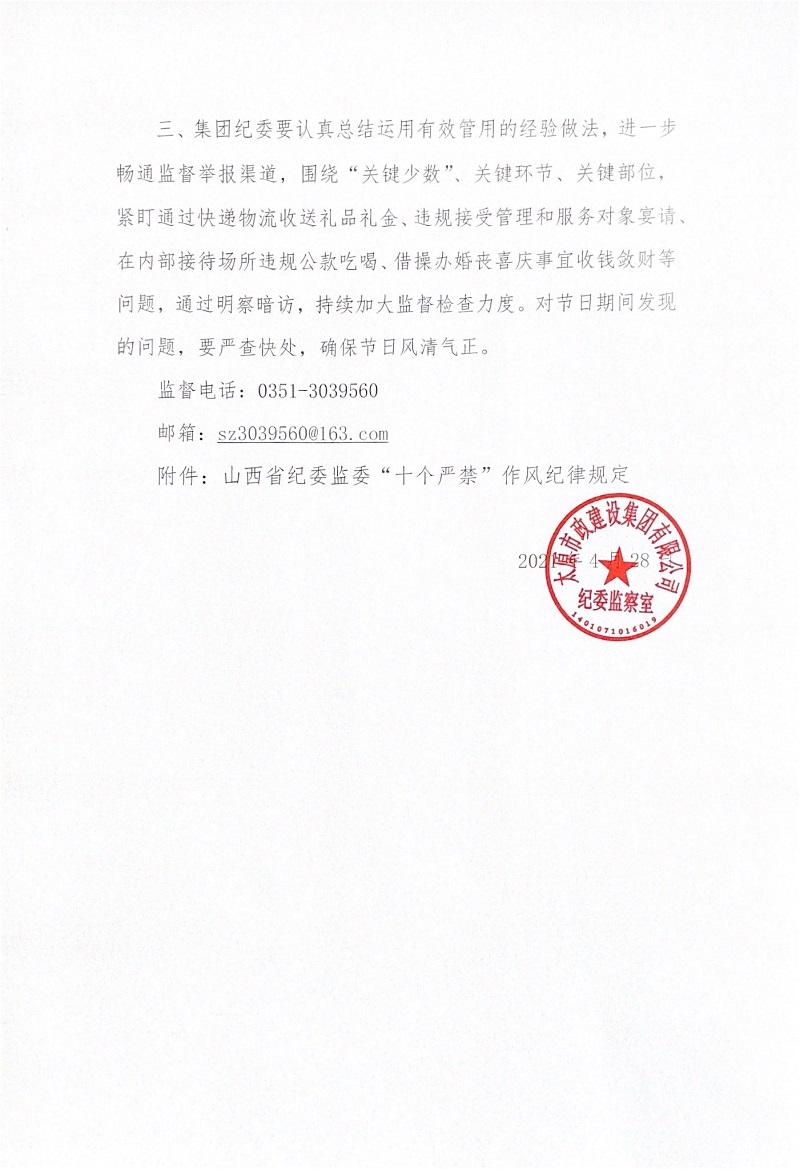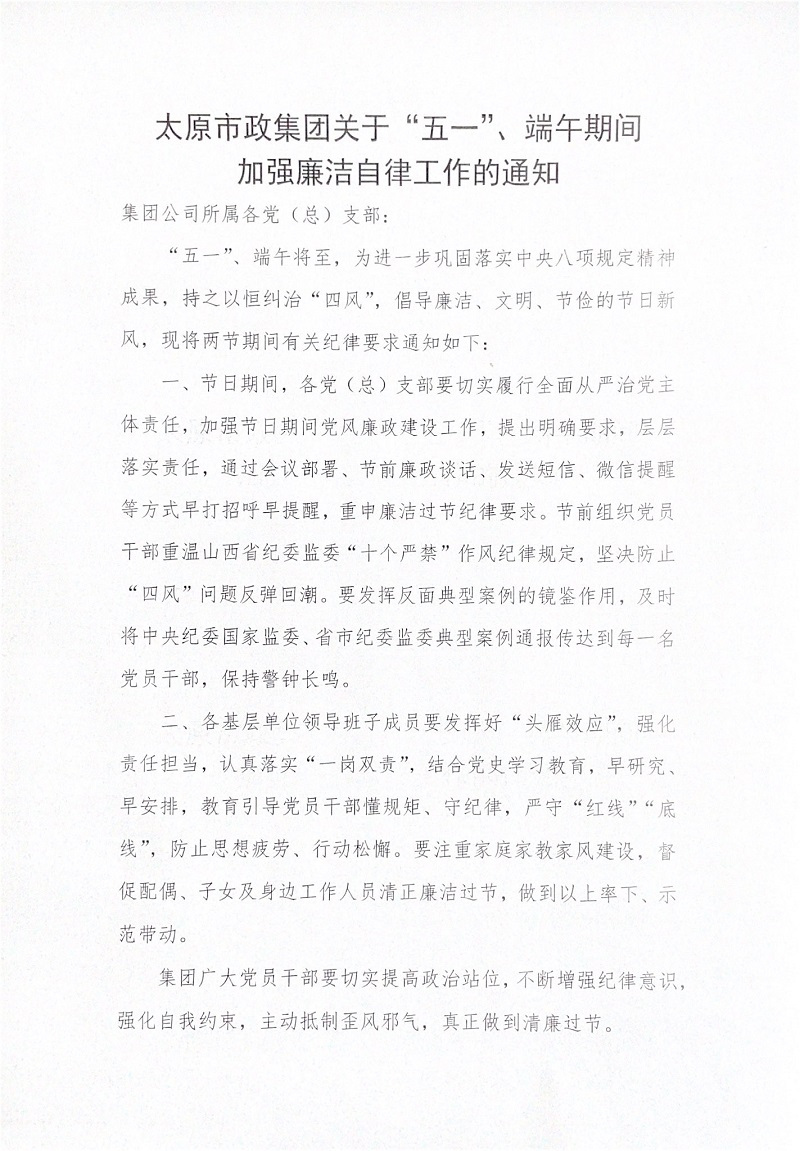 太原市政集團關于“五一”、端午期間加強廉潔自律工作的通知