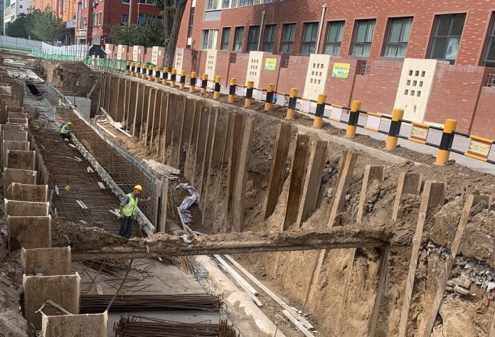 施工中,面對無法開展大面積施工,且施工路段無放坡條件等難題,項目部迅速行動、倒排工期,將工期分解到周、計劃到天,各項安排落到實處,明確全員崗位職責,組織機械和人工齊上陣,同時展開多個作業面,加速推進工程進展。在黑土巷中橫馬路郝家溝路段施工中,項目部采用打設鋼板樁支護措施,有效保障周邊建筑物安全,且該路段施工場地緊鄰學校,為不影響師生九月初正常通行,項目部安排施工人員加班加點對周邊拆遷產生的大量建筑垃圾和渣土進行清運,并集中力量加快推進該路段的施工進度,組織人員晝夜輪替兩班倒,確保趕在正式開學前完成施工任務。