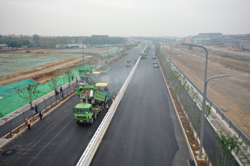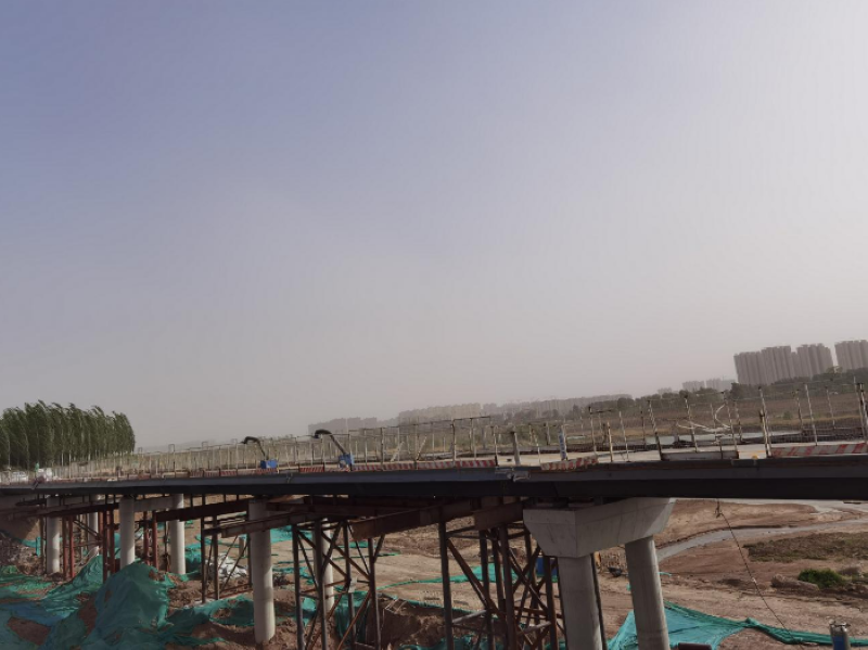 濱河東路南延二期工程施工一標段北起迎賓路,南至設計樁號K5+500,道路全長約5.3公里,設計紅線寬為51.5-60米,施工內容包括人行地下通道、排水、電力、下穿通道、高架橋、道路工程,于2021年12月開工建設,由一公司、三公司共同承建。該工程作為市重點項目,一公司強效組織、積極籌劃,確立“精心組織、精準對標、精細管理、精致施工”的理念,采取“分段管理”的施工方案,確立七個工區,并安排專人負責各工段,形成全面開花、相互協作的工作局面,大力提高施工效率。施工中,項目部錨定目標節點,制定施工計劃,冬季施工中認真做好混凝土養護和保溫工作,有效防止混凝土凍裂;采用放坡和拉森鋼板樁+鋼支撐的支護方式,嚴格控制鋪筑厚度逐層回填夯實,為施工奠定堅實基礎;合理調配110臺機械、854名施工人員24小時倒班不間斷作業,最快一天連續鋪筑瀝青混凝土1800米,掀起“大干不停歇”的施工熱潮。2022年9月,一公司圓滿完成全部施工任務,在全線七個標段中名列前茅,為汾河東岸再填一條平坦大道。三公司全體參建人員與時間賽跑,從各施工區域土方工程破土動工,到墩柱、橋梁相繼“沖出”地平線,爭時間、搶進度,是該工程第一個完成首聯箱梁澆筑的標段。其中,橋梁工程是整個工程的重中之重,結合工程自身特點,現澆箱梁采用滿堂紅盤扣式支架法進行施工,大大提高了模板安裝精度和施工質量,降低了模板、腳手架的安裝難度;項目部嚴格把控瀝青混凝土鋪設這最為關鍵的一步,攤鋪機勻速前進,刮平后立即檢查,及時進行人工充分壓實。項目部肩負光榮使命,齊心協力戰疫情、斗風沙、頂驕陽、冒暴雨,及時排除項目建設過程中難點、堵點問題,以腳踏實地的努力,保證了一個個節點目標的如期完成,確保施工進程“不歇步”,合力攻堅、全速推進,用敬業和擔當詮釋了實干精神,彰顯了市政人“闖”的精神,“創”的勁頭。
