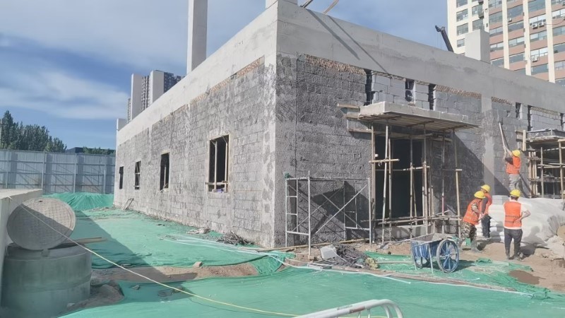 該工程主體結構施工主要包括鋼筋綁扎、模板安裝、混凝土澆筑三道工序,參建人員強化全過程管控,通過細化綁扎流程、細化安裝步驟、細化澆筑過程“三個細化”,確保主體結構施工穩(wěn)固與安全。細化綁扎流程,項目部精準定位鋼筋綁扎具體點位,結合首次承接鋼筋用量達1600多噸的施工情況,提前組織人員學習鋼筋綁扎的技術規(guī)范和要點,仔細核對鋼筋型號、尺寸及數量,確保與設計圖紙一致,綁扎時嚴格確保位置、間距和交叉點的牢固,以形成穩(wěn)固的結構體系,并多次復核檢驗鋼筋綁扎數量及搭接長度、焊接飽滿度、鋼筋間距等指標是否規(guī)范,保證驗收合格后接續(xù)進行模板安裝。細化安裝步驟,項目部按照測量放線位置,確定模板標高、垂直度,以鋼筋為基準,圍繞其四周進行模板固定,利用木方將模板逐一進行固定,組織工長、質檢員等挨個檢測安裝厚度、方木密度及對拉螺栓強度,確保安裝穩(wěn)固、支架安全。細化澆筑過程,項目部及時檢測混凝土坍落度、標號,采用“分層對稱澆筑”施工方法,每完成一層澆筑后進行振搗,保證表面光滑,并及時苫蓋塑料膜進行養(yǎng)護,保證澆筑整體一次成型。