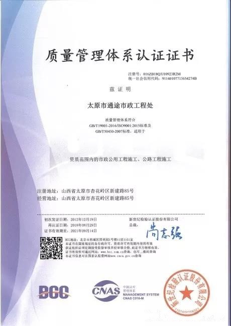 本次認證審核工作得到了審核組的充分肯定,進一步促進了通途市政工程處生產經營管理的規范化、科學化。