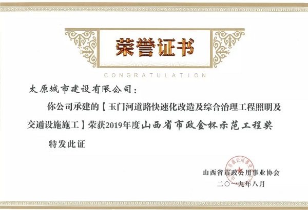 近日,太原城建公司玉門河道路快速化改造及綜合治理工程照明及交通設施工程榮獲山西省市政公用事業協會頒發的2019年度“山西省市政金杯示范工程獎”。太原城建公司靳耕榮獲2019年度“山西市政工程優秀項目經理”榮譽稱號。