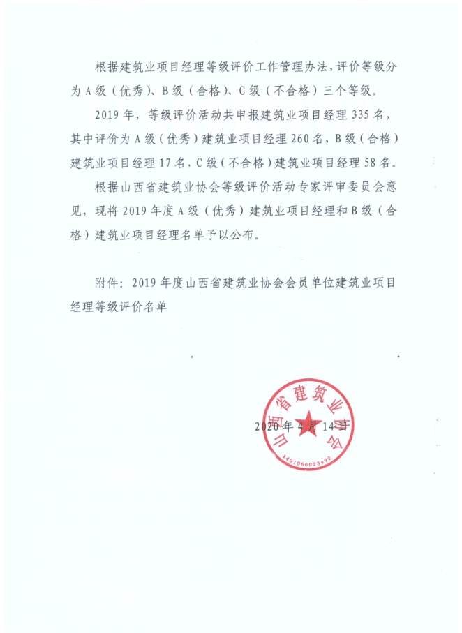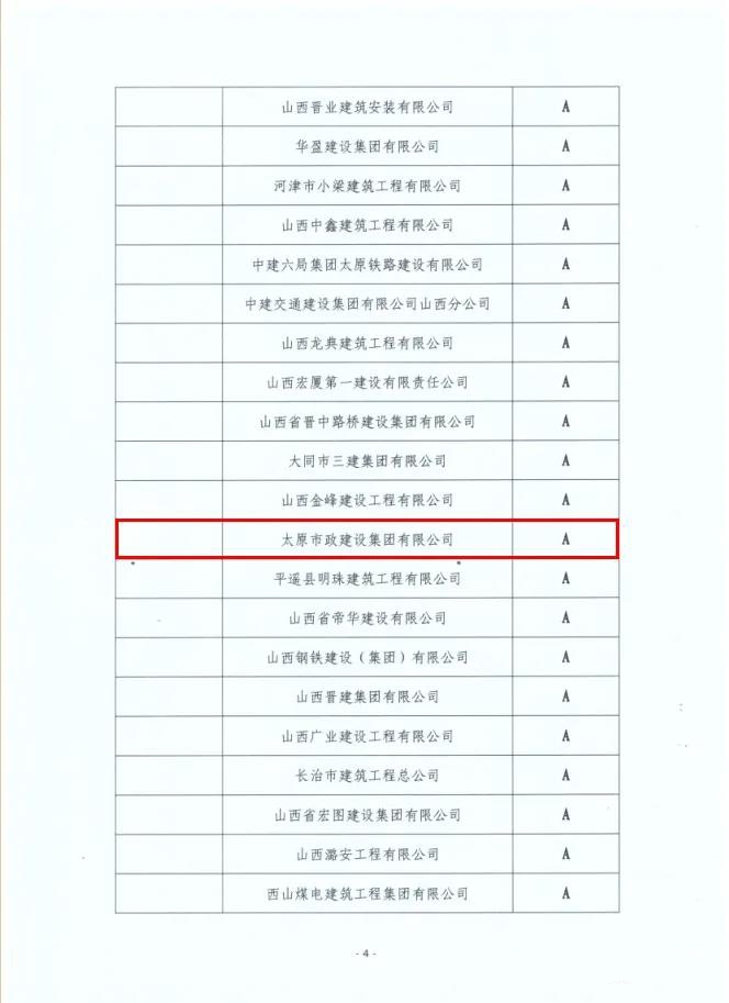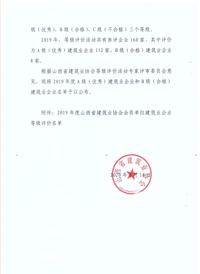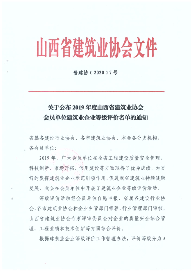 近日,山西省建筑業(yè)協(xié)會公布2019年度建筑業(yè)企業(yè)等級評價名單,集團公司被評為2019年度山西省A級(優(yōu)秀)建筑業(yè)企業(yè)。
