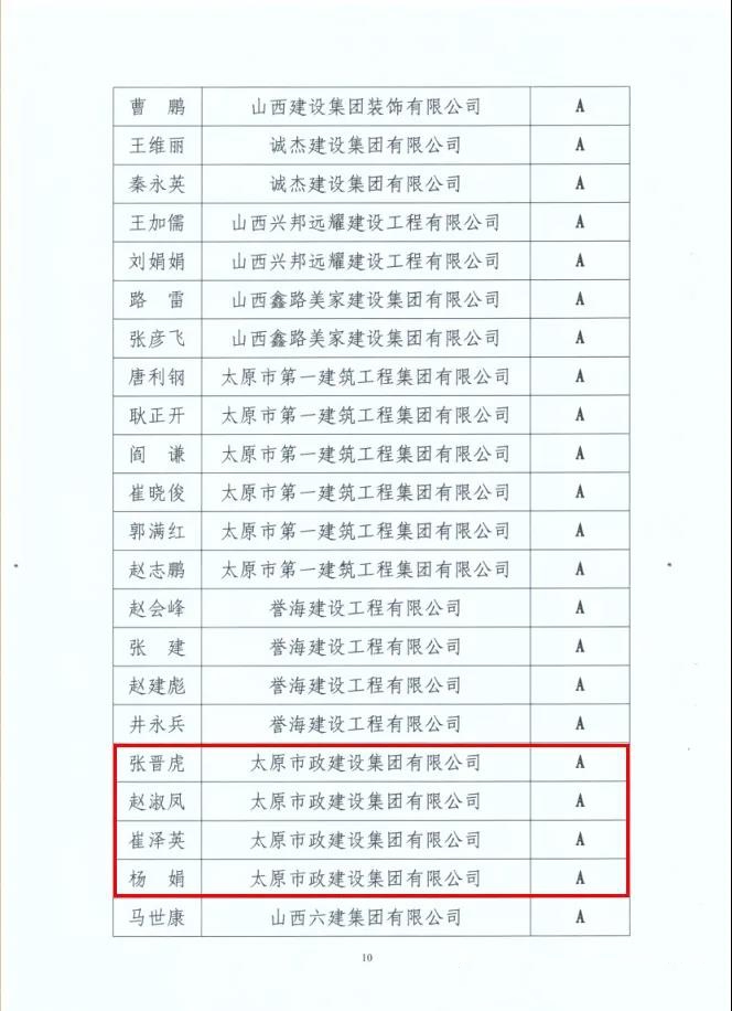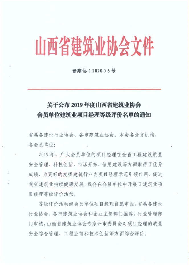在“2019年度山西省建筑業(yè)協(xié)會會員單位建筑業(yè)項目經理等級評價”評選結果中,集團公司張晉虎、趙淑鳳、崔澤英、楊娟被評為2019年度山西省建筑業(yè)A級(優(yōu)秀)項目經理。