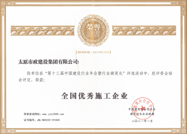 2021年1月,中國建筑業合作平臺建設行業企業聯盟召開“第十三屆中國建設行業年會暨行業頒獎禮”,會上,集團公司榮獲“全國優秀施工企業”榮譽稱號。