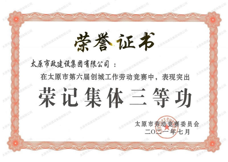 太原市第六屆創城工作勞動競賽集體三等功榮譽證書